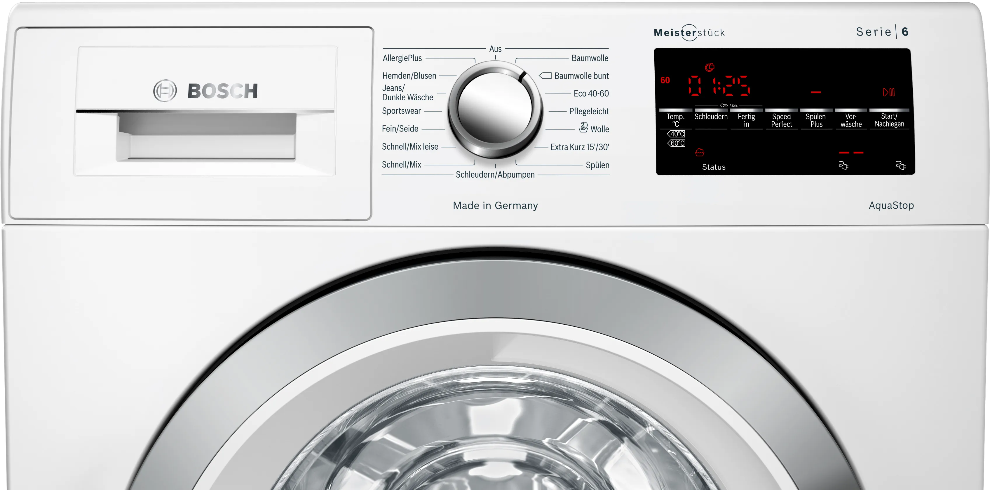 قسمت مواد شوینده در بخش بالایی سمت چپ بدنه قرار دارد و امکان قرارگیری انواع مواد شوینده را فراهم میکند. روی این کشو مواد شوینده یک لوگو BOSCH قرار دارد که اصالت بالای کالا را به رخ می کشد. ولوم چرخان بزرگ در وسط پانل کنترلی، امکان انتخاب برنامههای مختلف شستشو را فراهم میآورد. در سمت راست هم صفحه نمایش LED در یک پس زمینه مشکی قرار گرفته و اطلاعات مربوط به زمان باقیمانده، دما و سرعت را نمایش میدهد. درب ماشین لباسشویی بوش WAG28492 با رنگ نقره ای مزین است. روی این درب یک شیشه حرارت دیده نصب شده تا شما به صورت واضح داخل لباسشویی را مشاهده نمایید.